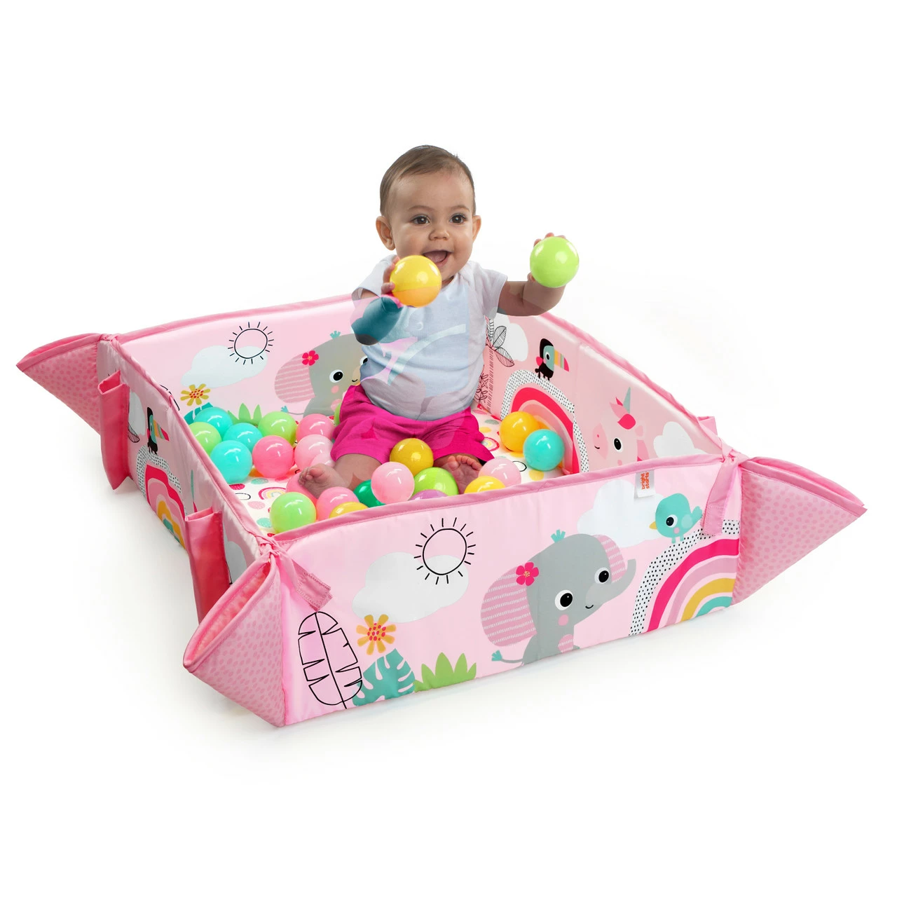 You can even adjust the plush walls down or up to fill the play gym with 40 colourful balls, making the joy last through the toddler years! Mom and dad can get in on the action (and get lots of co-play bonding time) by dropping the balls through the mesh canopy hole. As baby grows up, she can practice motor skills by dropping the balls herself! For younger babies, the jumbo playmat lays flat for tummy time (psst, we even added in a tummy time prop pillow). The cheerful elephant toy plays music and lights up to catch and keep baby’s attention. You’ll love the Rainbow Tropics fashion complete with colourful confetti patterns, unicorn pals and more. Playtime is all around with 6 additional toys: bead chaser, unicorn crinkle toy, baby-safe mirror, flash cards, hanging leaf toy and bead rattle. Who’s ready to have a ball with Bright Starts?
