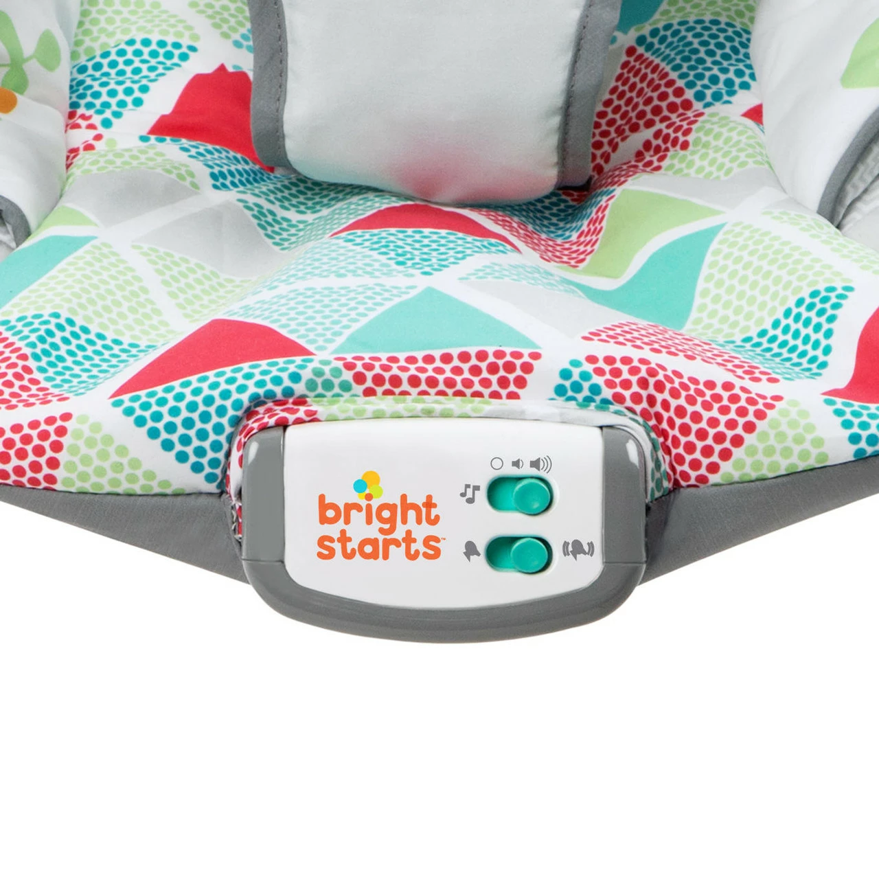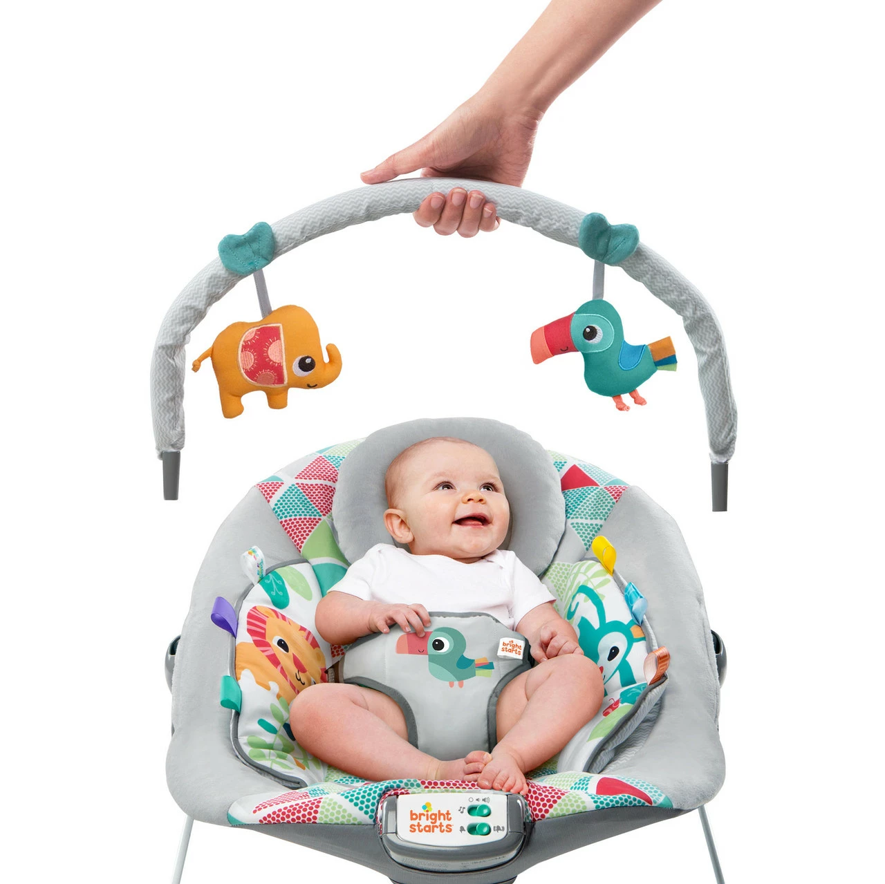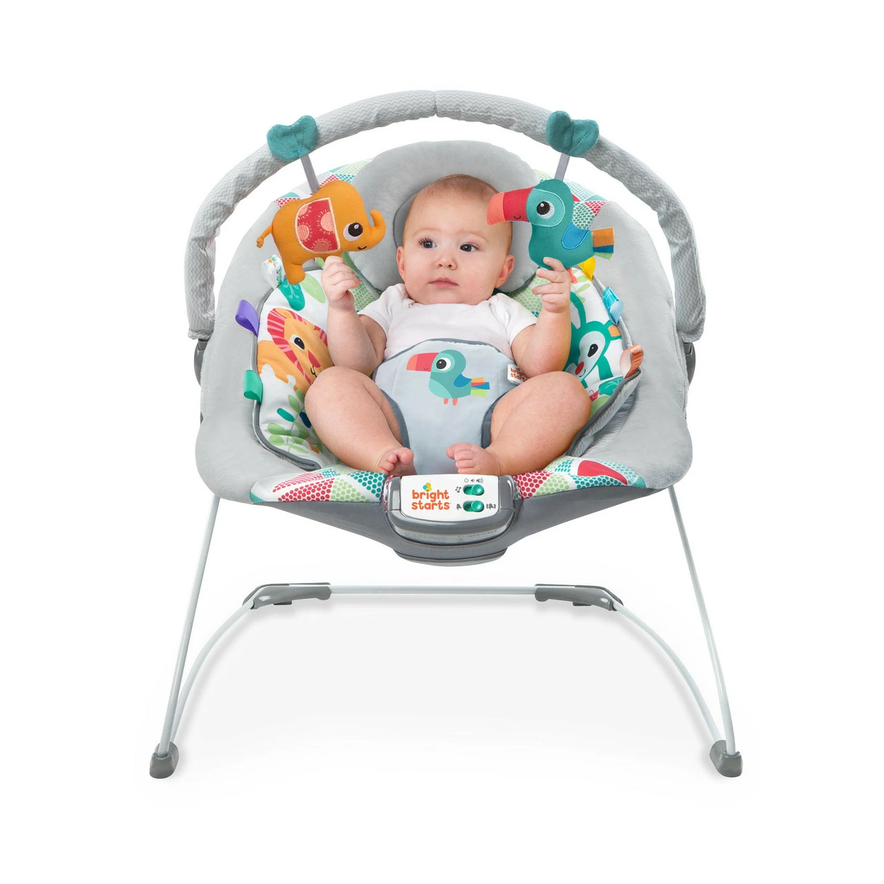 The Bright Starts™ Toucan Tango™ Bouncer will have your little one smiling in no time. The cradling seat provides the perfect amount of comfort and support with soothing vibrations, plush fabrics, integrated bolster, and removable headrest. Colourful, engaging characters and patterns make this seat fun! Baby will love the soothing sensation of the Taggies satin tags. Entertain baby with seven, fun melodies. The toy bar removes easily with one hand and amuses baby with 2 cheerful toys. Adjustable 3-point harness to keep baby secure and the seat pad is machine-washable.